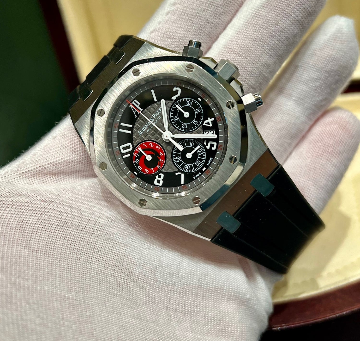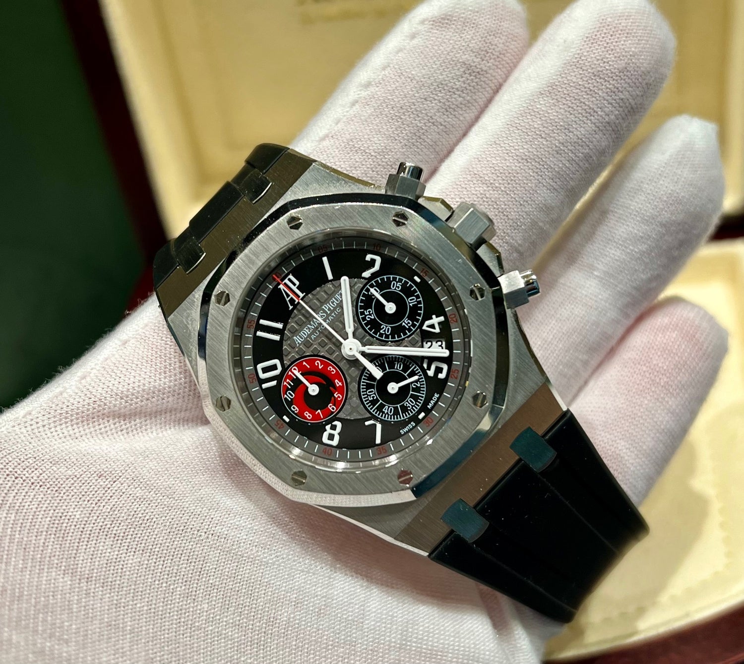 Quadrante: quadrante nero con texture "méga Tapisserie", numeri arabi bianchi a contrasto e audaci accenti rossi sul quadrante secondario e sulla pista esterna. Il quadrante dei piccoli secondi a ore 6 presenta un caratteristico motivo rosso in stile regata.